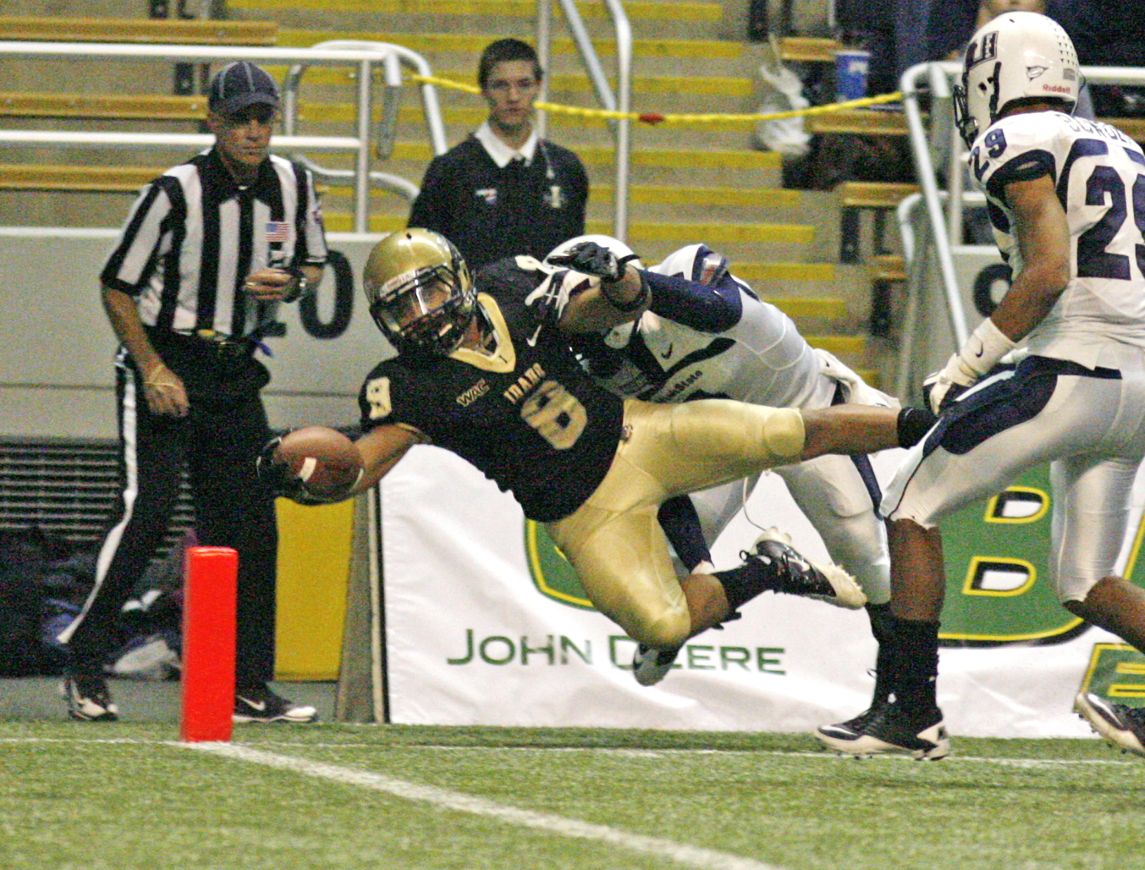 Idaho’s Kama Bailey (8) jumps and misses the end zone in the second half of an NCAA college football game against Utah State on Saturday in Moscow. Utah State won 49-42 in double overtime. ESPN boxscore here. (AP Photo/Alicia Carlson)