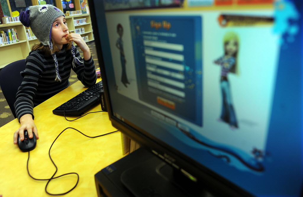 Ten-year-old Emma Wagner uses the Coeur d’Alene Library’s computers to access the Internet on Wednesday. Computers in the children’s section of the library are filtered. Idaho passed a law this year requiring all public libraries to filter children’s Internet access by next October. (SR photo: Kathy Plonka)