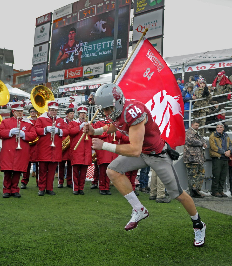 WSU senior Jared Karstetter of Spokane and Ferris High School runs onto the turf of Martin Stadium in Pullman for his last home game as a Coug Saturday. The senior class players were introduced to the crowd prior to kickoff. Washington State, 4-7, missed its chance to land a bowl offer by falling 30-27 to Utah in overtime at Martin Stadium. (SR photo: Christopher Anderson)