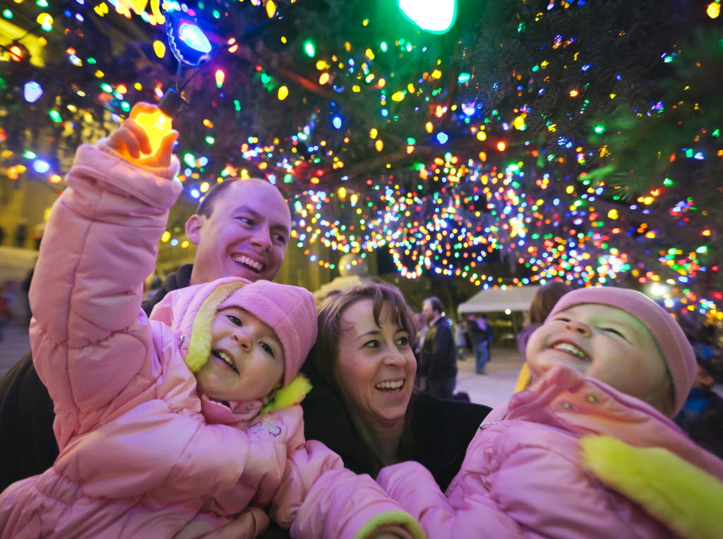 Jason and Emily Gray, of Boise, hold their two-year-old twins Lacey and Ashley Gray, under the the holiday lights at the annual Capitol Christmas Tree Lighting ceremony in Boise. Hundreds of people young and old gathered at the steps of the Idaho Statehouse event, sipping hot chocolate and listening to holiday music from children’s choirs and military bands. (AP Photo/Idaho Statesman: Darin Oswald)