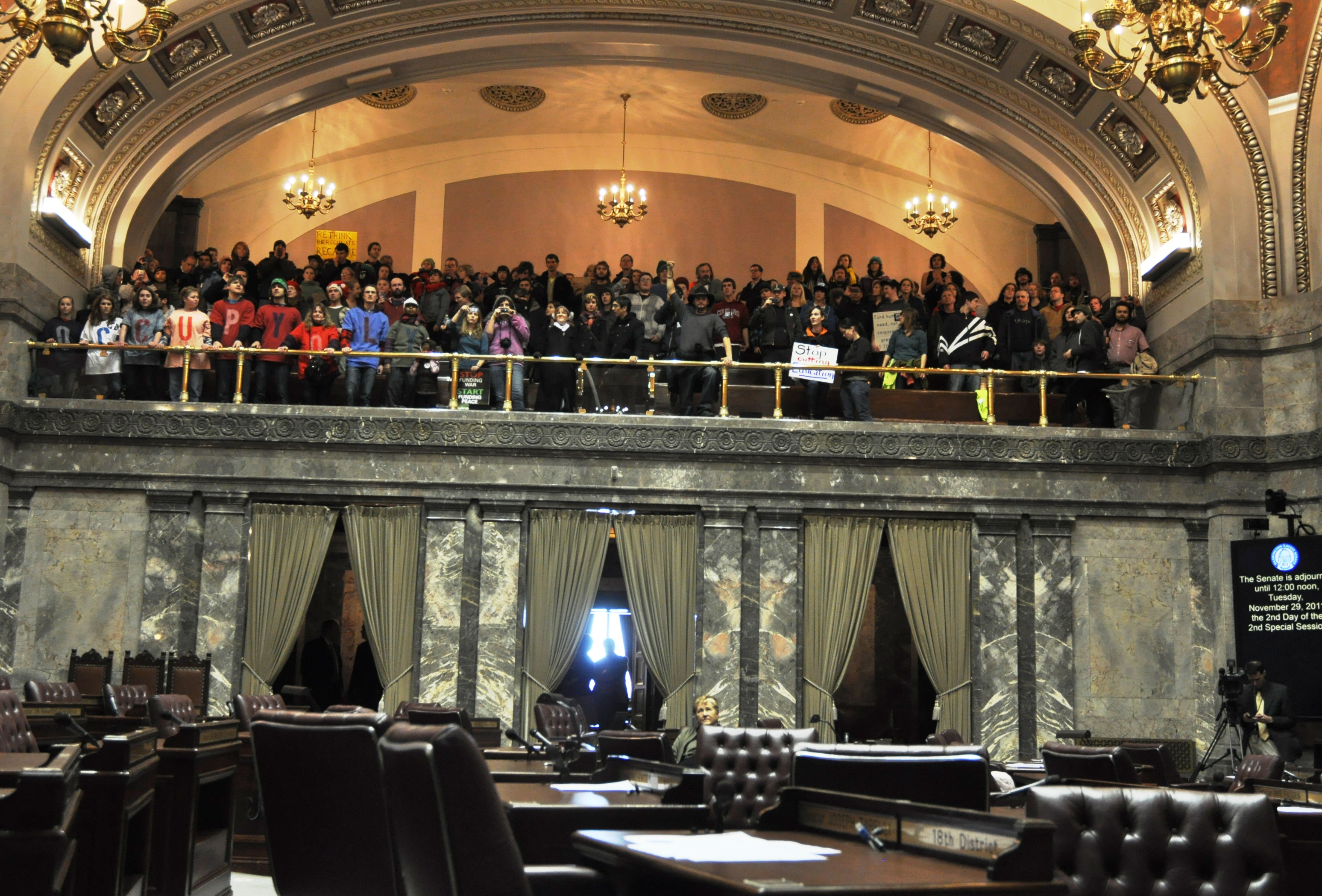 When some 200 “occupiers” crowded into the Senate gallery Monday, they chanted for about a half-hour to a mostly empty chamber.