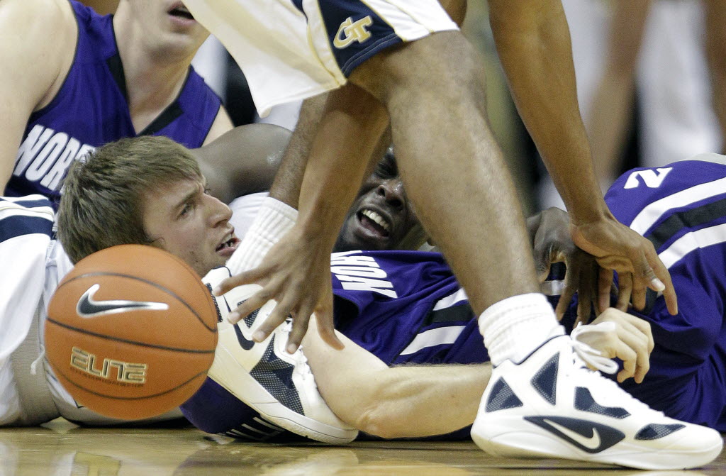 Georgia Tech guard Mfon Udofia, center, is seen through the legs of teammate Glen Rice Jr. as he chases a loose ball against Northwestern guard Alex Marcotullio, left, during the first half of an NCAA college basketball game today in Atlanta. (AP Photo/David Goldman)