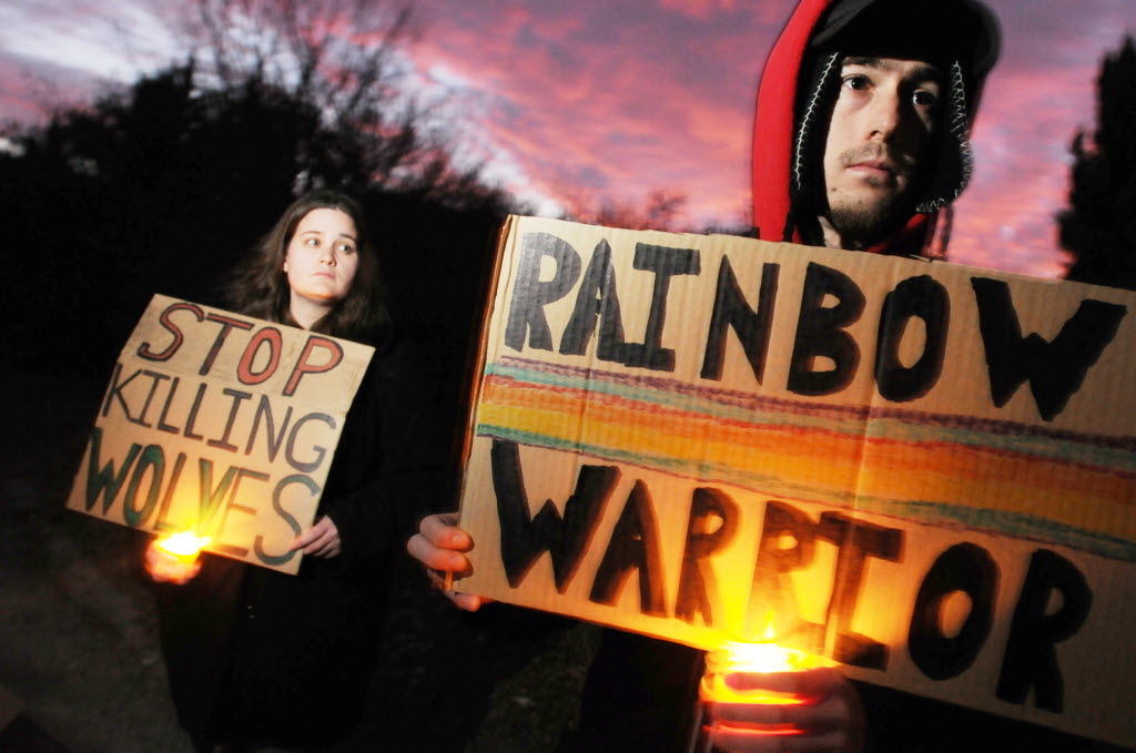 Corrie Miller, of Ontario, Ore., left, and Richard Wise Bear, of Corvallis, Ore., right, hold signs as they hold a candlelight vigil for “all the fallen wolves” Tuesday, outside the Idaho Department of Fish and Game office on Powerline Road in Nampa. (Idaho Press-Tribune/AP photo: Greg Kreller)