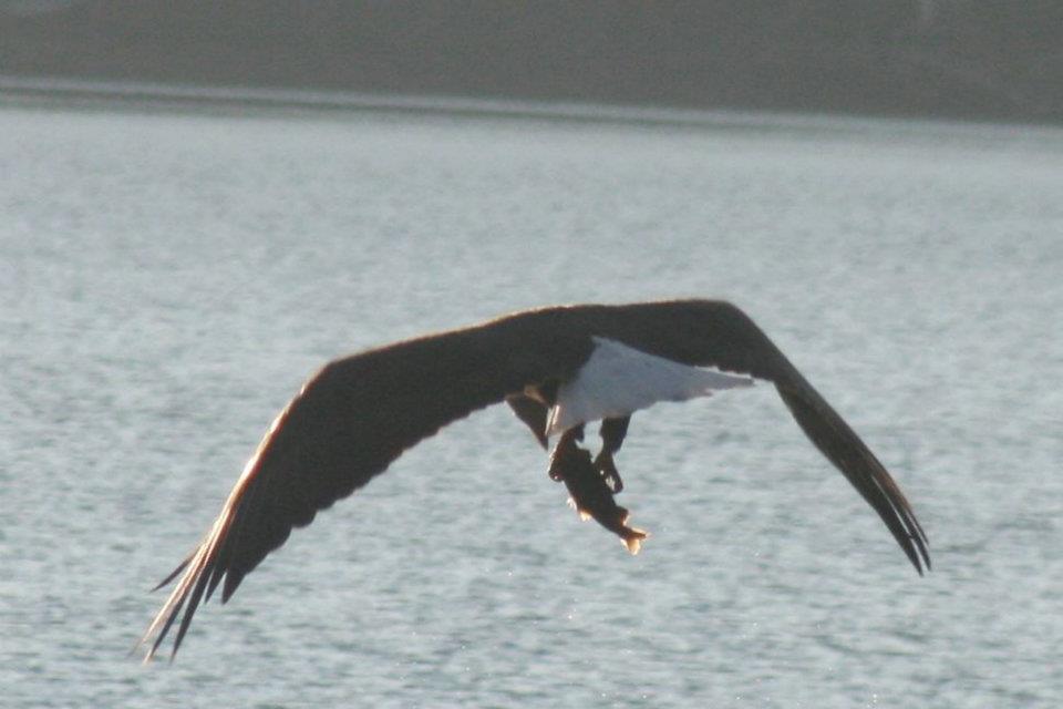 “On the last day of November I headed out to Higgins Point in late afternoon to see if the eagles were feeding,” writes Kerri Thoreson on her Facebook wall . “No sooner had I walked down the trail to the water than a lone eagle appeared overhead. Had to scramble to get my camera out and when he actually grabbed the salmon from the water, he was between me and the bright sun. But I did shoot a photo of him flying off with his catch. I love living where just a few minutes from my front door I can witness such a thing.”