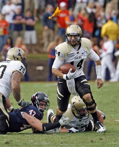 Idaho quarterback Brian Reader eyes a penalty flag during a play against Virginia during an NCAA college football game Saturday in Charlottesville, Va. Idaho lost in overtime to the ACC Virginia Cavaliers 21-20 when a 2-point conversion attempt fell short. (AP Photo/Richmond Times-Dispatch, P. Kevin Morley)