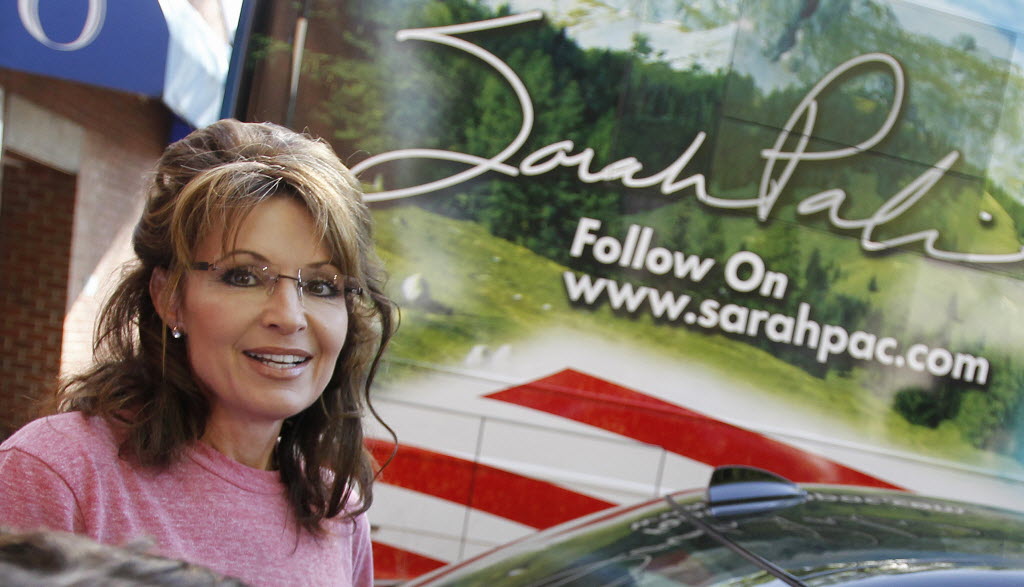 Former Alaska Gov. Sarah Palin stands near her tour bus outside a hotel in Boston in this June 2 AP file photo.