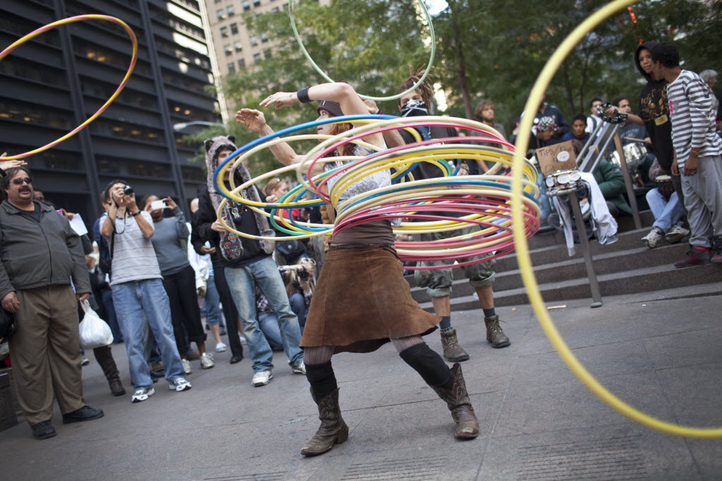 A woman who identified herself as “Marygoround” attempts to balance numerous hoolahoops while others toss more hoolahoops at her, during the “Occupy Wall Street” protests in Zuccotti Park in New York, on Friday. The three-week-old campout in a lower Manhattan plaza looks like a jumble of tattered sleeping bags, but teams of volunteers working on food, sanitation, health care and other needs keep the shifting population of protesters functioning like an impromptu city within the city. (AP Photo/Andrew Burton)