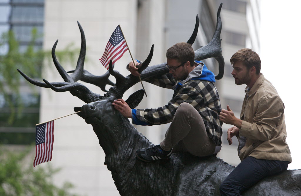 A pair of Occupy Portland marchers put flags on the elk statue next to Lownsdale Square where the group ended its parade through downtownThursday in Portland, Ore. The Occupy Wall Street movement came to Portland Thursday in a peaceful demonstration that began along the Willamette River, wound through the streets of Portland and concluded in Lownsdale Square, a park across the street from federal court. (AP Photo/The Oregonian, Randy L. Rasmussen)