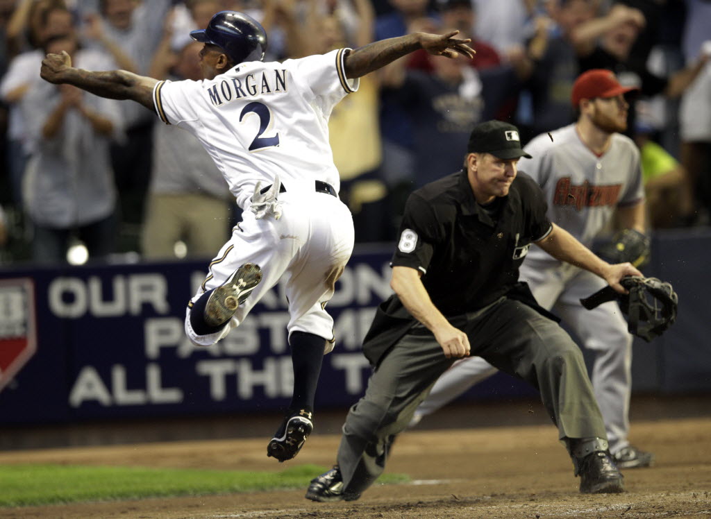 Milwaukee Brewers’ Nyjer Morgan (2) reacts after scoring during the fourth inning of Game 5 of baseball’s National League division series against the Arizona Diamondbacks this afternoon in Milwaukee. Moments ago, Morgan knocked in the winning run in extra innings, for a 3-2 victory, and move Milwaukee into the National League championship series with the winner of tonight’s St. Louis-Philadelphia game. (AP Photo/David J. Phillip)