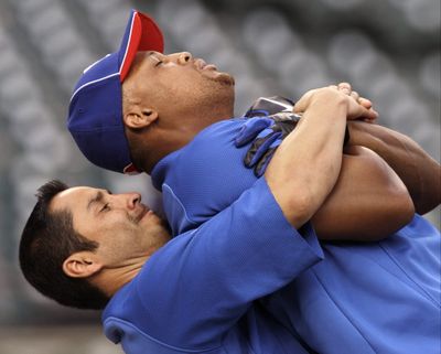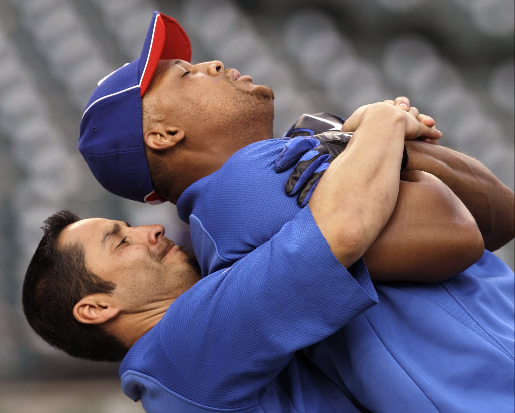Texas Rangers massage therapist Raul Cardenas works on third baseman Adrian Beltre before Game 3 of baseball’s American League championship series against the Detroit Tigers today in Detroit. (AP Photo/Paul Sancya)