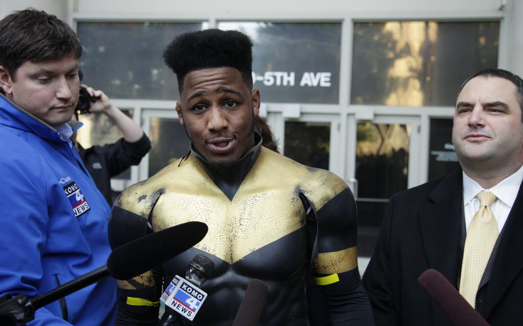 Ben Fodor, a self-styled superhero who goes by the name “Phoenix Jones,” talks to reporters as he stands next to one of his attorneys, Matt Hartman, right, after Fodor appeared in court today in Seattle. Prosecutors have not yet filed charges against Fodor after he was arrested Sunday after police say he pepper sprayed a group of people downtown as they left a nightclub. Seattle Times story here. (AP Photo/Ted S. Warren)