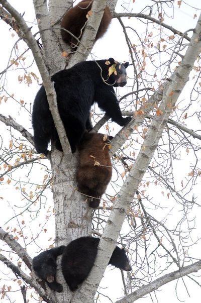 a mother bear and her four cubs take refuge in a tree near US 93 just south of Whitefish, Mont. The bears quickly drew a crowd as both sides of the highway were lined with parked cars and people stopping to take photos. Daily Inter Lake story here. (AP/Daily Inter Lake, Brenda Ahearn)