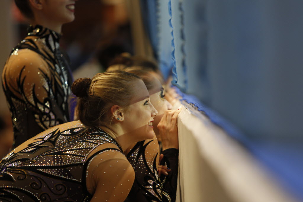 Unidentified gymnasts of the United States watch from behind a curtain as their teammate, Julie Ashely Zetlin, not shown, receives the gold medal after winning the rhythmic gymnastics individual ball final competition during the 2011 Pan American Games in Guadalajara, Mexico, Monday. (AP Photo/Dario Lopez-Mills)