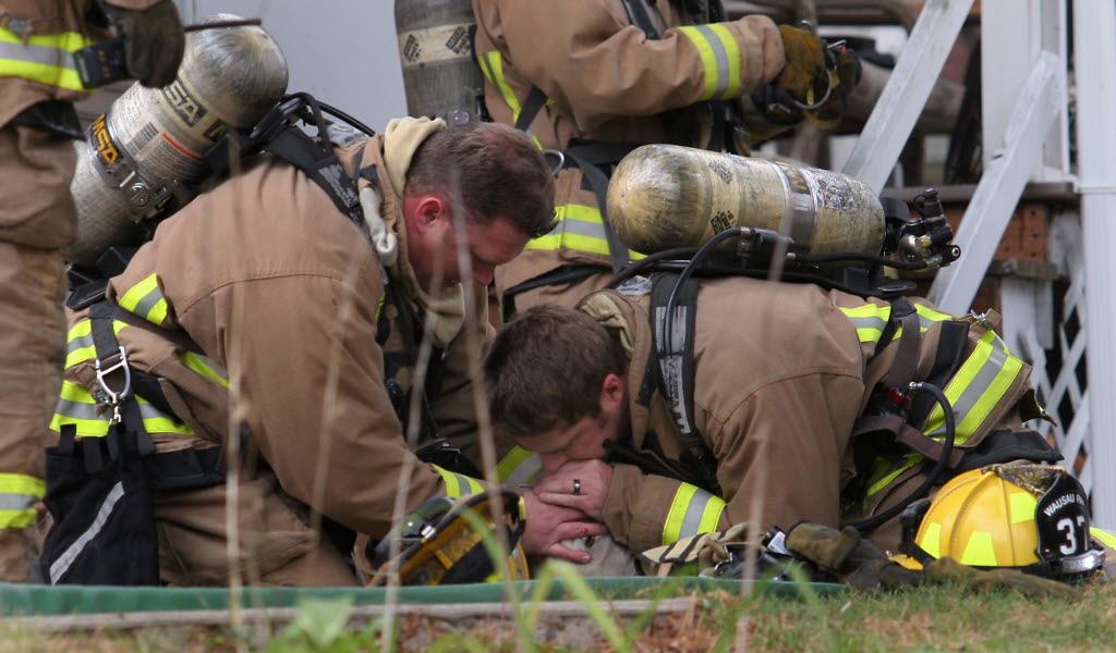 Wausau firefighters Jared Thompson, left, and Jamie Giese give artificial respiration to a dog that was rescued from a house fire in Wausau, Wis., Tuesday, Oct. 18, 2011. The dog, a 7-year-old yellow lab named Coda, was reported to be in good condition following the incident. AP Photo/Dan Young/Wausau Daily Herald)