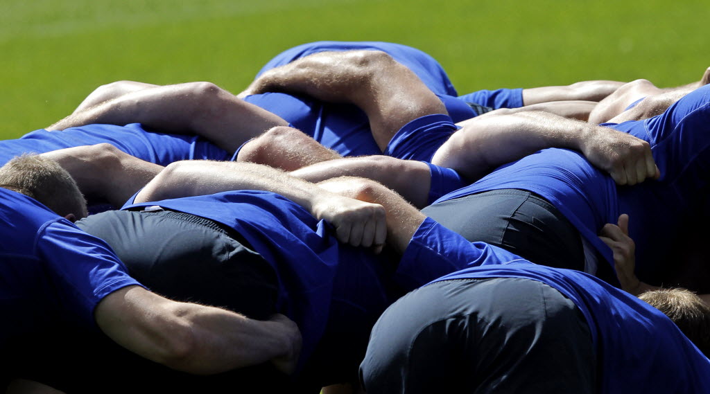 French rugby players practise a scrum during a training session in Auckland, New Zealand, Thursday. France will play the New Zealand All Blacks in the final of the Rugby World Cup on Sunday. You write the cutline. (AP Photo/Christophe Ena)