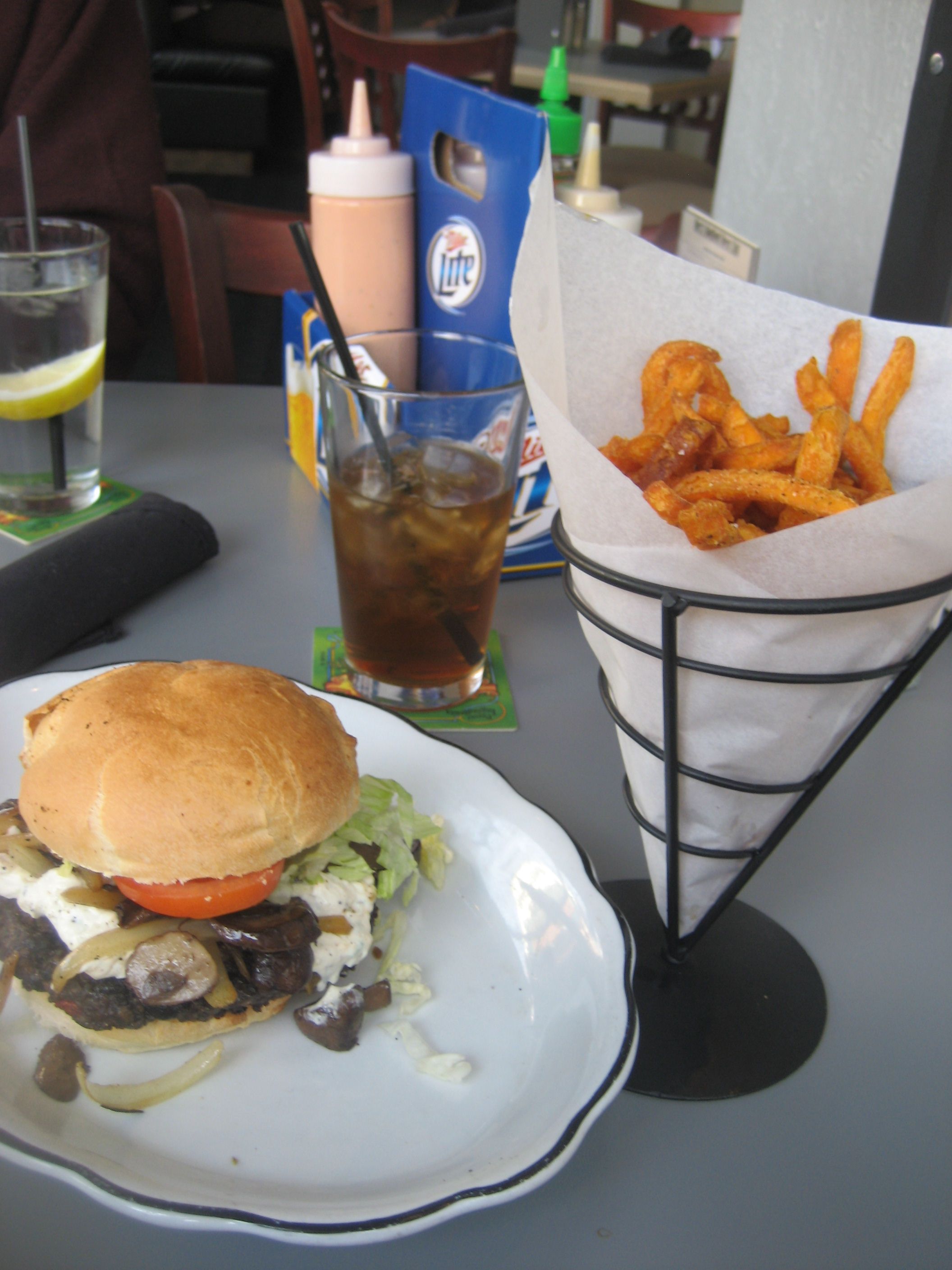I stopped in with a group for friends for lunch and ordered the bean burger topped with Boursin cheese, grilled mushrooms and onions. It was one hot, delicious mess. Thank goodness for the sturdy handmade buns to hold the precarious pile of grub together. It was $7.95. The cheese sauteed mushrooms and grilled onions added $1.75 to the ticket.