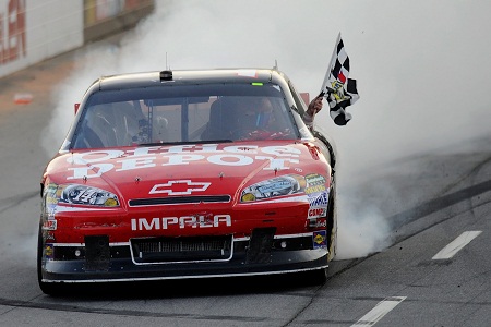 By the time Brian Vickers wrecked for the fifth time to bring out the 18th and final caution—three short of the track record—Stewart had worked his way to second in time for the three-lap run to the finish.