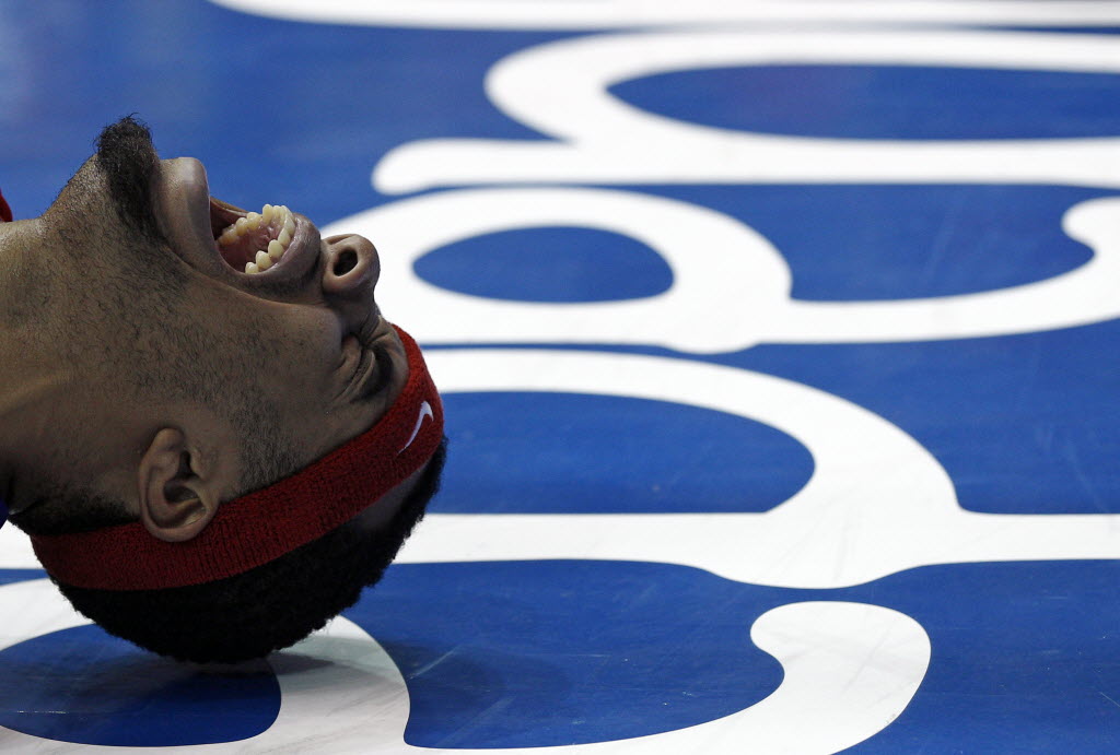 Carlos Strong from Puerto Rico, reacts after falling during the men’s basketball match for the gold medal against Mexico at the Pan American Games in Guadalajara, Mexico, Sunday. (AP Photo/Daniel Ochoa de Olza)