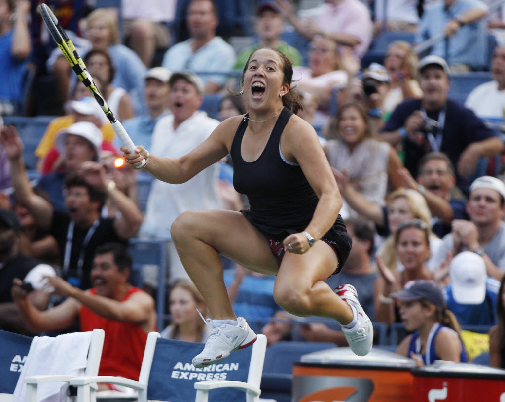 Irina Falconi, of the United States, leaps in the air after beating Dominka Cibulkova, of Slovakia, during the U.S. Open tennis tournament in New York, Wednesday. Falconi won 2-6, 6-3, 7-5. You write the cutline. (AP Photo/Charles Krupa)
