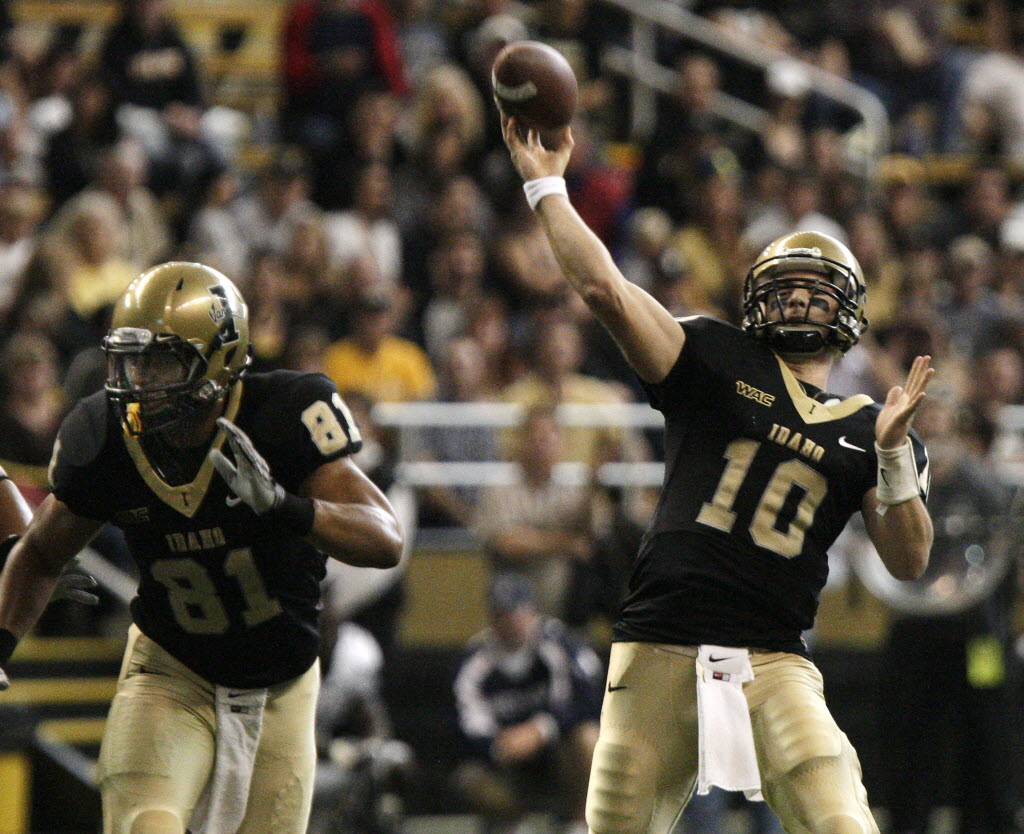 Idaho quarterback Nathan Enderle (10) attempts a pass as tight end Taylor Elmo (81) blocks during the second quarter of an NCAA college football game against Nevada last Nov. 6 at the Kibbie Dome in Moscow. The Chicago Bears have decided to keep Enderle on their roster although he may not be activated. Story here. (AP Photo/Dean Hare)