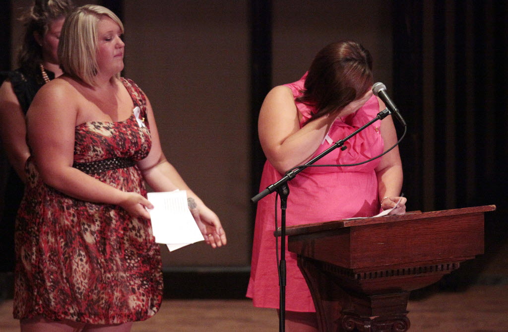 Kylie Brown, right, breaks down as she begins to speak about her sorority sister, Katheryn M. “Katy” Benoit, as Megan Short, left, moves to comfort her, during a memorial service for the slain University of Idaho graduate student, Wednesday on the UI campus in Moscow. Story here. (AP Photo/Dean Hare)