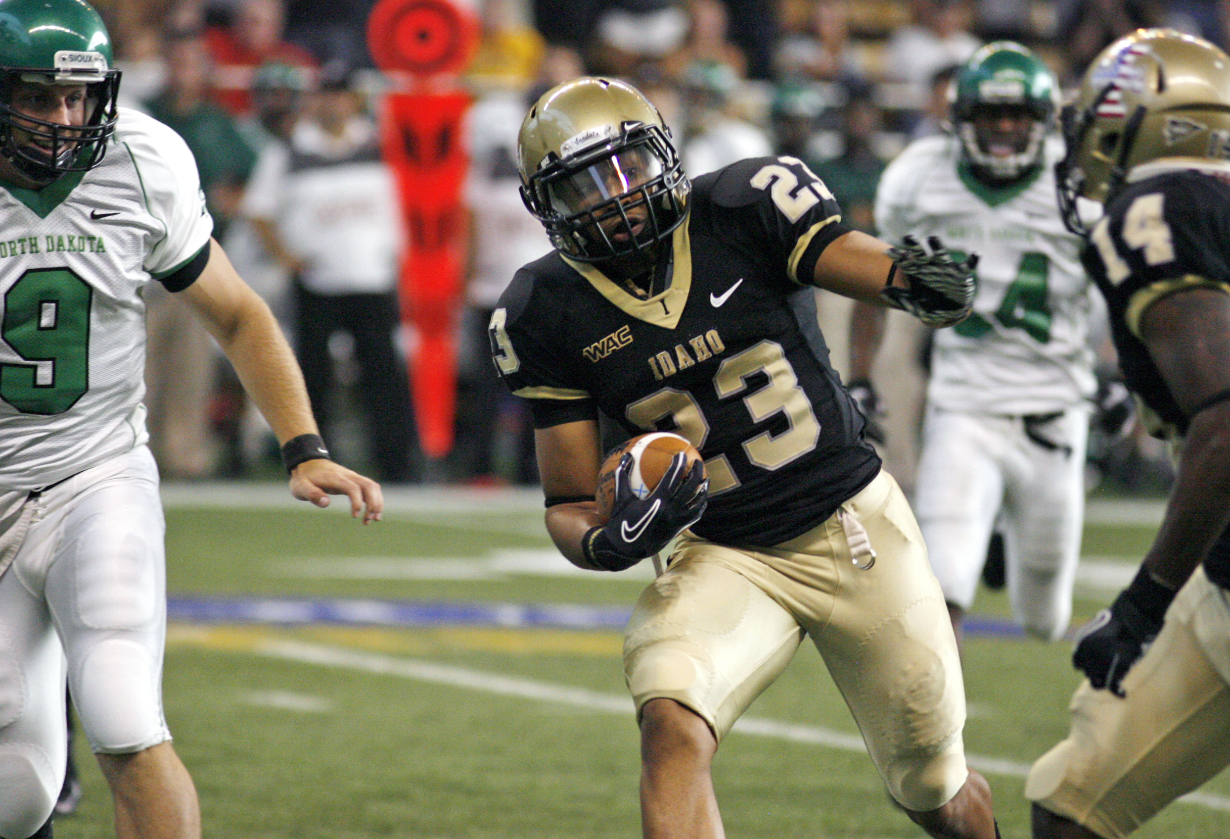 Idaho’s Cameron McKernan, (23) runs through a pocket to score as teammate Tracy Carter (14) blocks against North Dakota in the second half of an NCAA college football game today in Moscow. ESPN/AP game story and boxscore here. (AP Photo/Alicia Carlson)
