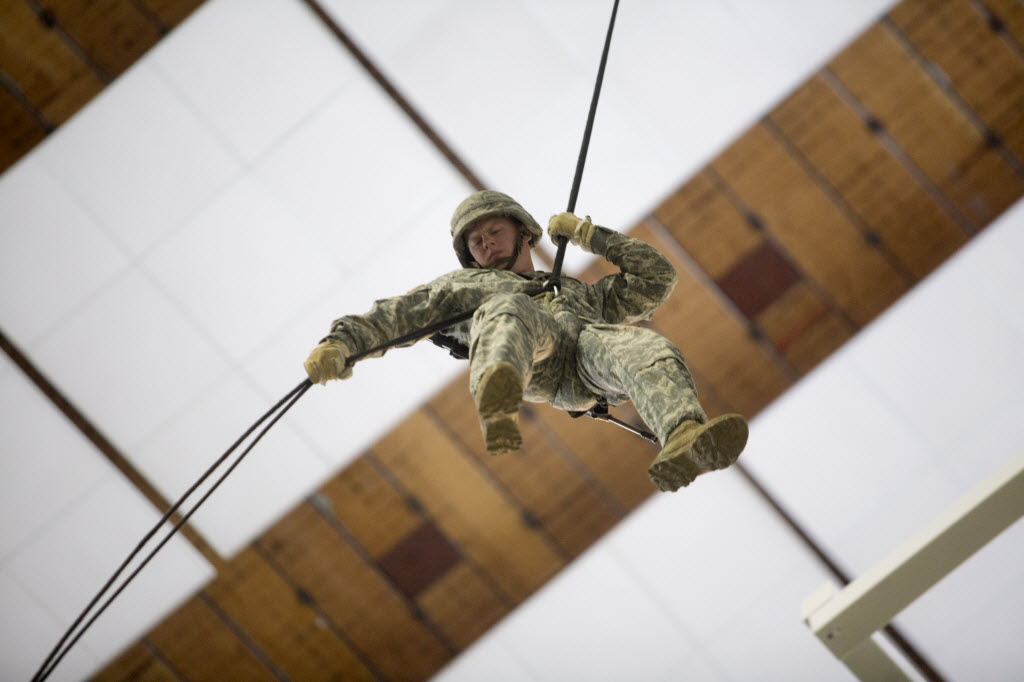 Cadet Lee Muench, a senior Biology major, repels down the side of the Kibbie Dome to present the kick-off coin at an NCAA college football game between North Dakota and Idaho on Saturday in Moscow. (AP Photo/Alicia Carlson)