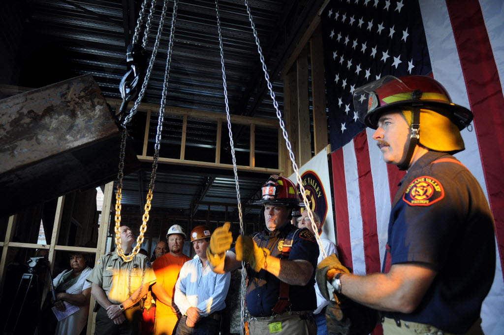 Spokane Valley Fire Department Capts. Pat Schaffer, right, and Tag Baugh hoist a 1,200-pound steel beam that was recovered from the World Trade Center into place at the department’s new administration building Sunday. SR photo/J. Bart Rayniak