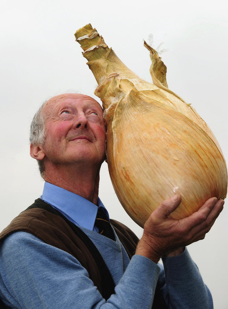 Peter Glazebrook from Newark, England holds his record breaking giant onion that weighed in at 8.150kg in the heaviest onion competition to claim a place in the Guinness book of World Records at the Harrogate, England Autumn flower show earlier today. You write the cutline. (AP Photo/John Giles/PA Wire)