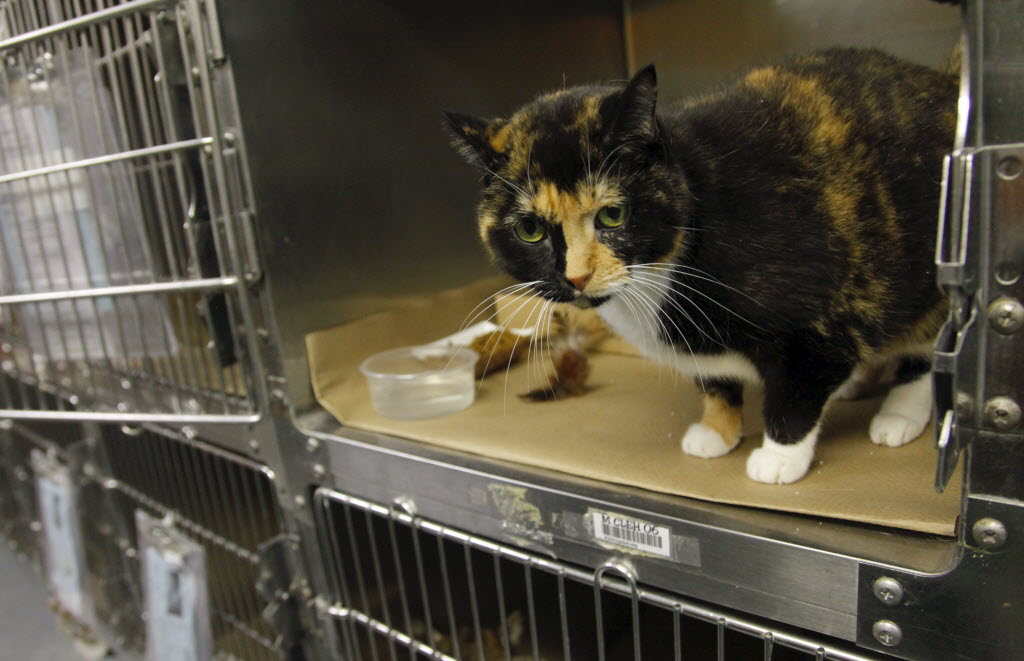 Willow, a 6-year calico cat that went missing from her Colorado home during a renovation 5 years ago, sits in a cage at her temporary home on Wednesday in New York’s Animal Care and Control (ACC) facility. Willow, found as a stray in Manhattan and brought to ACC, had been tagged with an identification microchip and will soon be reunited with her owners. Story here. (AP Photo/Bebeto Matthews)