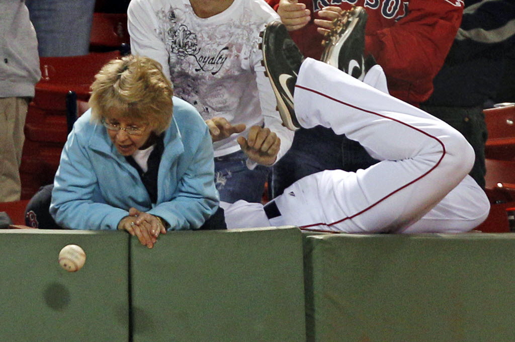 A fan watches as the baseball drops away as Boston Red Sox left fielder Conor Jackson, right, leaps into the crowd on an unsuccessful attempt to catch a foul ball by Baltimore Orioles’ J.J. Hardy in the first inning during the second game of a baseball doubleheader at Fenway Park in Boston on Monday. You write the cutline. (AP Photo/Charles Krupa)
