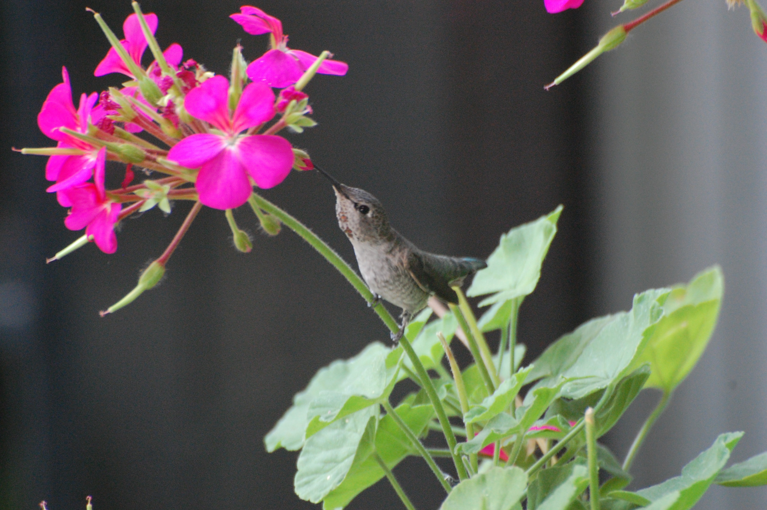 BIRDWATCHING — Inland Northwest birder Nancy Miller of Viola, ID, photographed this hummingbird this week — possibly a sub-adult male Anna’s hummingbird, experts say — feeding on her geraniums in a different way than she’s noticed before: