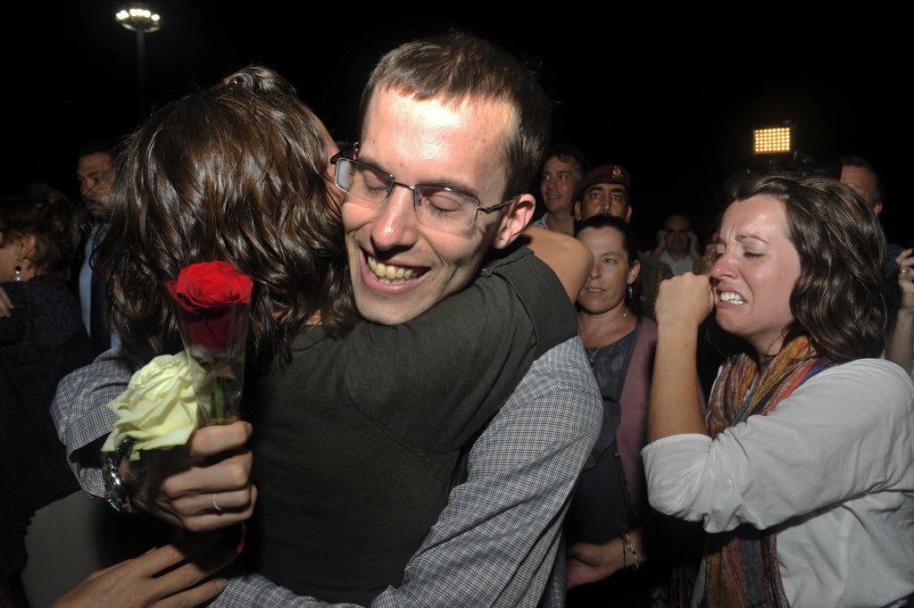 Freed American Shane Bauer, center is welcomed upon his arrival from Iran, in Muscat, Oman Wednesday. After more than two years in Iranian custody, two Americans convicted as spies took their first steps toward home Wednesday as they bounded down from a private jet and into the arms of family for a joyful reunion in the Gulf state of Oman. (AP Photo/Sultan Al-Hasani)