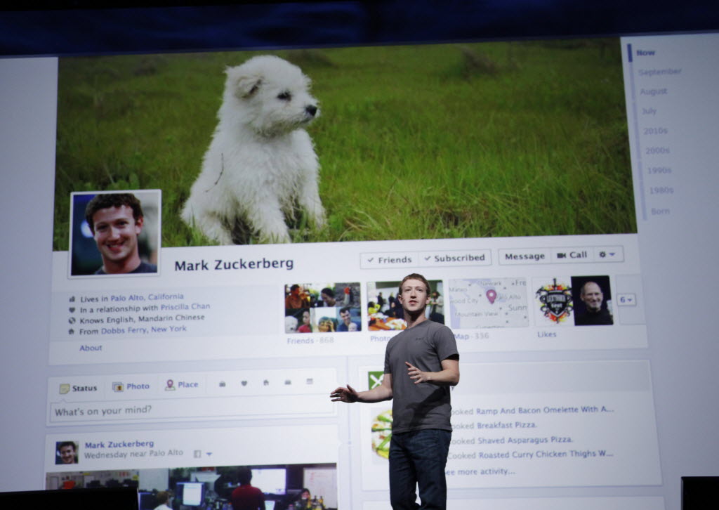 Facebook CEO Mark Zuckerberg shows Timeline during the f/8 conference in San Francisco this morning. Story here. (AP Photo/Paul Sakuma)