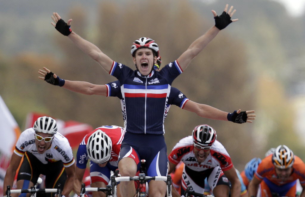 New world champion Arnaud Demare, front, and silver medallist Adrien Petit of France celebrate winning the men under 23 road race over 168 kilometers (104.4 miles) with start and finish in Holte, north of Copenhagen, Denmark, earlier today. (AP Photo/Peter Dejong)