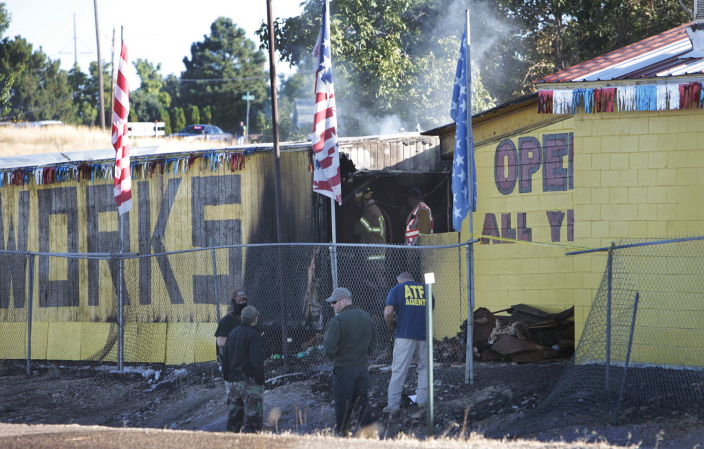 Emergency crews and ATF personnel investigate the scene after a fire at the Rocky Mountain Fireworks and Fur Co. near Caldwell on Monday morning. Animal rights activists said they pumped fuel into the fur and fireworks retailer before setting the place ablaze early Monday, and federal agents said they were taking the claim seriously. Story here. (AP Photo/Idaho Statesman, Katherine Jones)