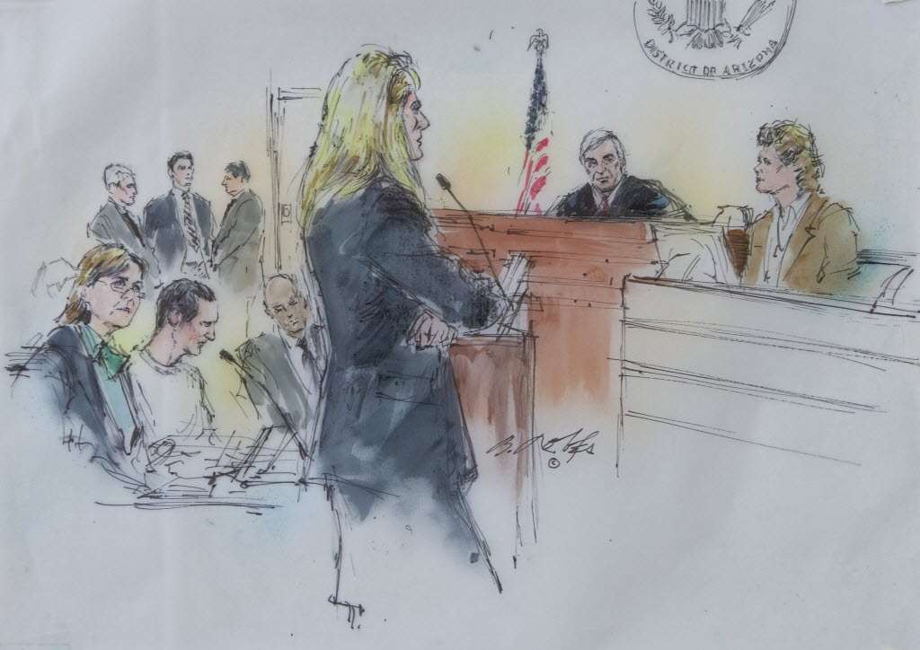 In this courtroom sketch, from left, Attorney Judy Clark sits with her client, Jared Lee Loughner as U.S. District Judge Larry Burns listens from the bench to testimony from Dr. Christina PIetz, far right, in federal court Wednesday in Tucson, Ariz. Suspected shooter Jared Loughner, who is charged with shooting U.S. Rep. Garbrielle Giffords, D-Ariz., and 18 others in January, was in court to face a mental competency hearing. (AP Photo/Bill Robles)