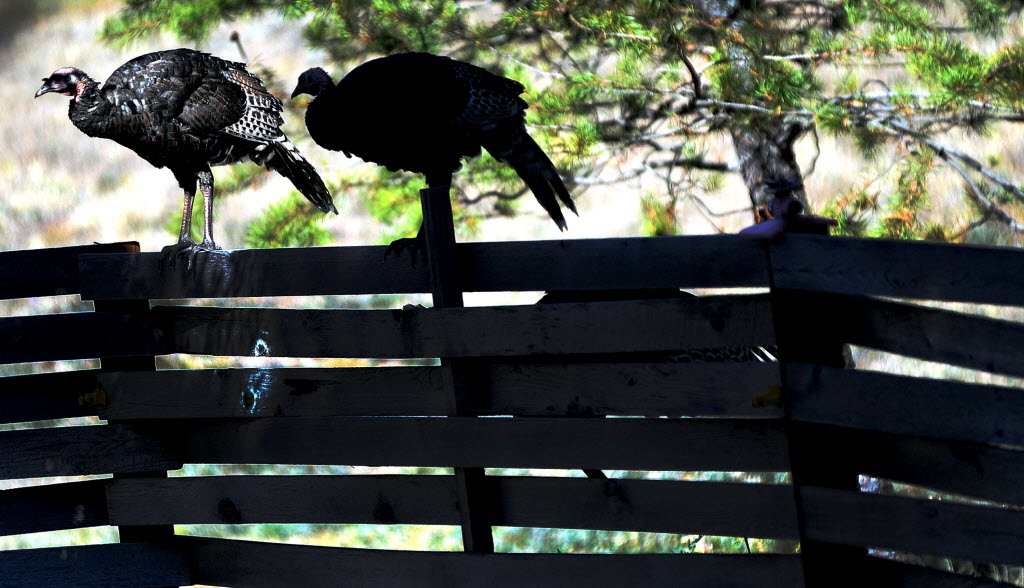 Turkeys perch on a fence near a home in Rathdrum earlier this afternoon. (SR photo: Kathy Plonka)