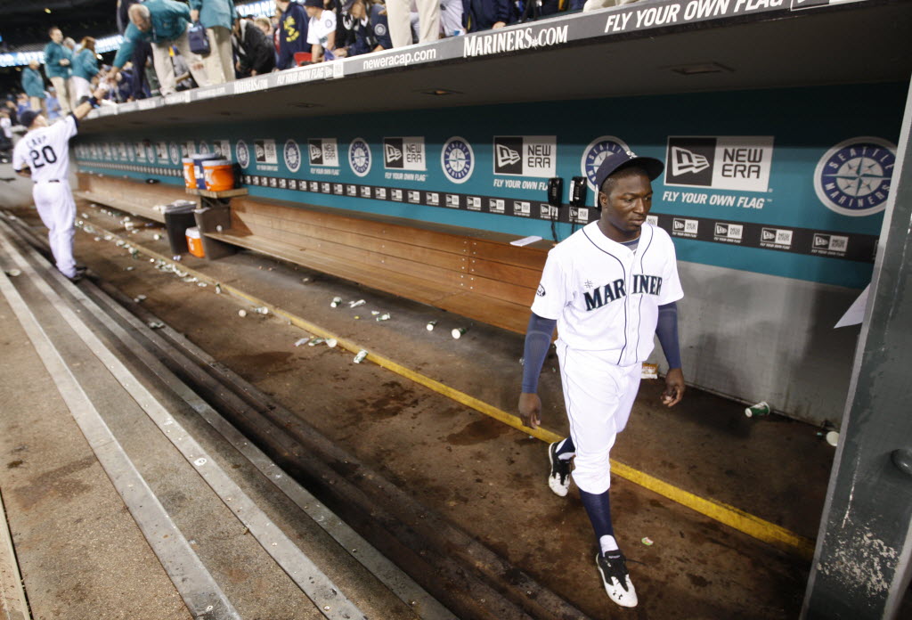 Seattle Mariners’ Trayvon Robinson walks ot of the dugout afterlosing to the Oakland Athletics 2-0 in a baseball game in Seattle on Wednesday. The Mariners finished the year 67-95 and last in the American League West Division again. Final Major League Baseball standings here. (AP Photo/Kevin P. Casey)