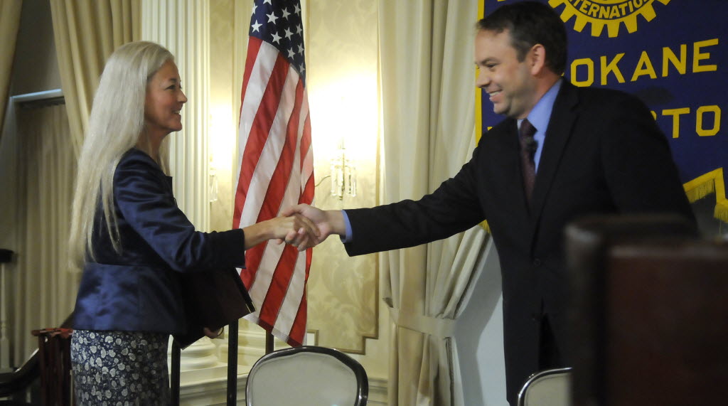 The two faced off Thursday afternoon at the weekly meeting of the downtown Rotary Club at the Spokane Athletic Club.