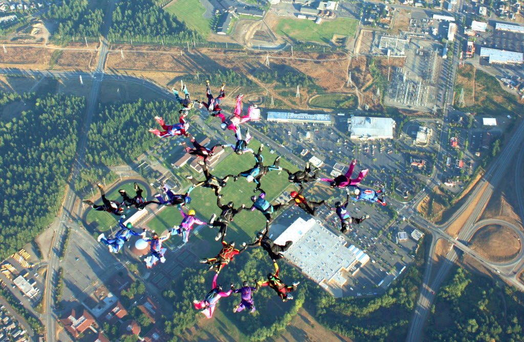 Living with a chronic auto-immune disease like lupus can feel like free falling through a medical minefield. Pain, frustration and fear are natural reactions while holding onto hope for more effective treatment and an eventual cure. Hope is one reason Spokane’s Cindy Stroup leaped from an airplane over Shelton, Wash., on Aug. 20 to join hands and feet with 25 other female sky divers in a record-setting formation. Jill Barville SR story here. (Courtesy photo: Cindy Stroup)