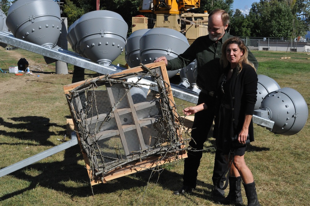 Biologist Jane Fink and Don Veltkamp of Birds of Prey Northwest examine the nesting platform atop the new light array before advising: Lose the hardware cloth. It posed a snagging hazard. The platform is equipped with an “osprey cam” to enable wildlife enthusiasts to watch the birds of prey from nest’s-eye view. Story here .
