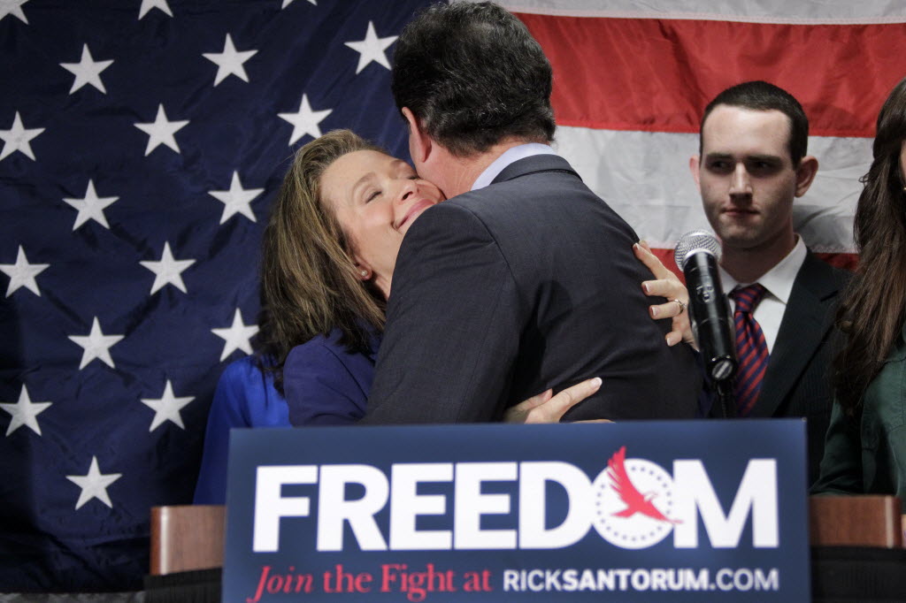 Former Pennsylvania Sen. Rick Santorum gets a hug from his wife Karen after announcing he is suspending his candidacy for the presidency today in Gettysburg, Pa. (AP Photo/Gene J. Puskar)