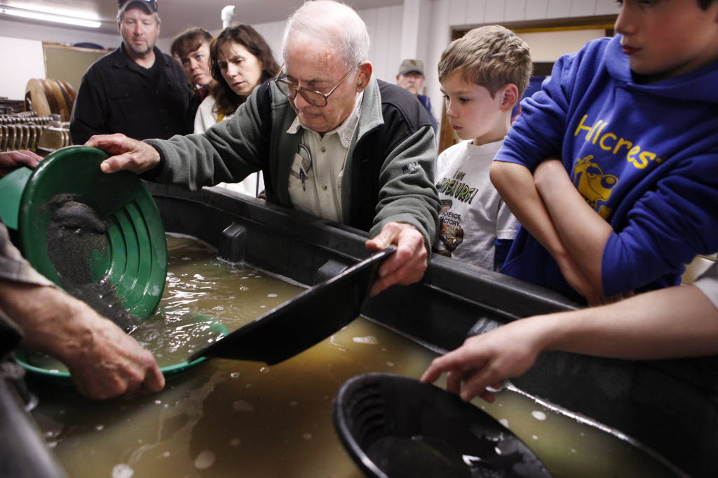 Bill Peabody shows novices how to separate gold from black sand suing water and a gold pan during the recent gold prospectors show in North Bend, Ore. Peabody has been prospecting as a hobby for 30 years. He started combing the ground for fossils in the Midwest. While he’s never struck it rich, the idea keeps him going. “Maybe if I roll one more rock it’ll be gold,” he said. (AP Photo/The World, Benjamin Brayfield)