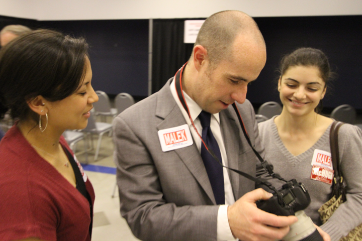 Luke Malek, candidate for the Idaho Legislature, along with two supporters, reviews photographs taken of him at the Tea Party Candidates Forum held Wednesday night.