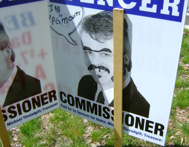 A Berry Picker snapped this photo of a vandalized sign belonging to Kootenai County commissioner candidate Larry Spencer at 4th & Lunceford in Coeur d’Alene. I’m sure this is some sort of crime. But not sure what. Misdemeanor vandalism? What?