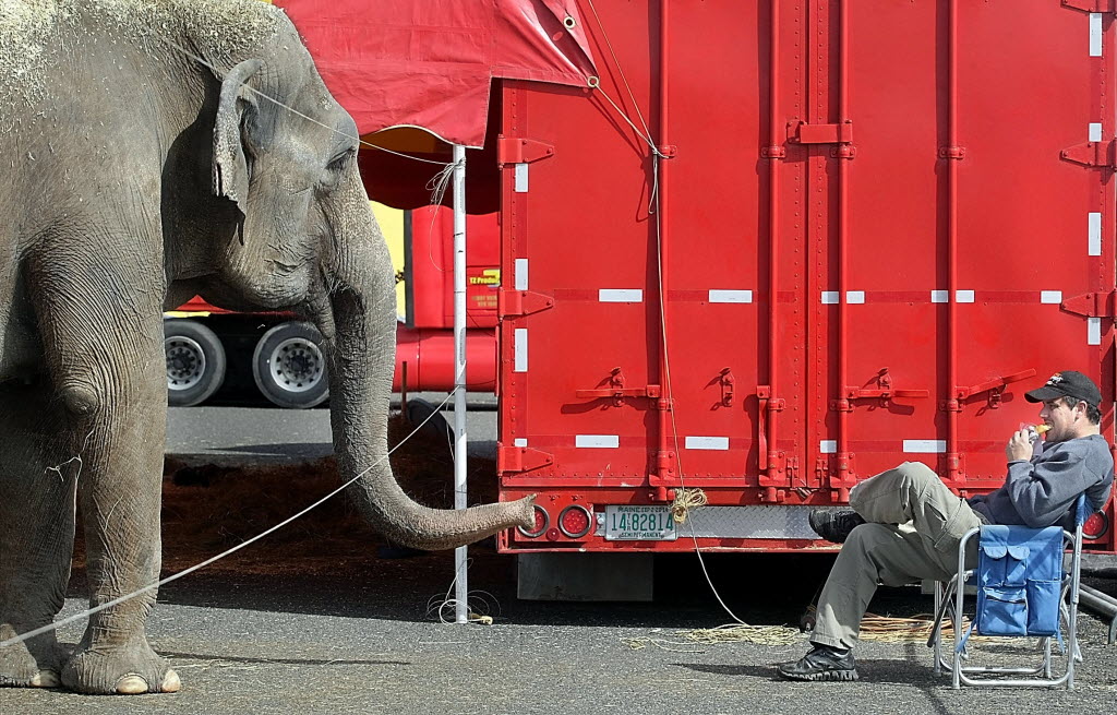 A circus elephant named Shelly watches her trainer, Dwayne Brake, eating a pastry Tuesday in Pasco, Wash. The Tarzan Zerbini Circus performers have set up the big top for their presentation of the Shrine Circus performances starting Thursday evening. (AP Photo/The Tri-City Herald, Bob Brawdy)
