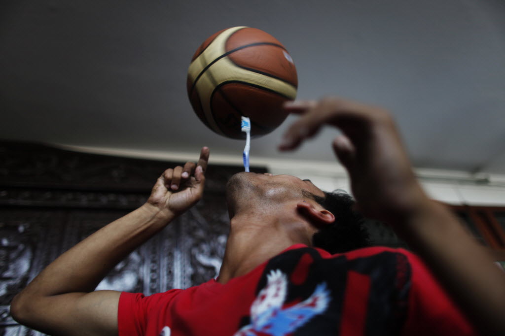 Nepal’s Thaneshwor Guragain spins a basketball on a toothbrush during his attempt to break the Guinness World Record set by Thomas Connors of the U.K., in Katmandu,Nepal, Thursday. Guragain reportedly spun the ball for 22.4 seconds in the attempt to break the existing record of Connors which is 13.5 seconds. (AP Photo/Niranjan Shrestha)