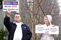 (Jerome A. Pollos’ Coeur d’Alene Press photo: Jennifer Drake of the Stop the Recall movement eyeballs recall proponent at City Hall April 4)