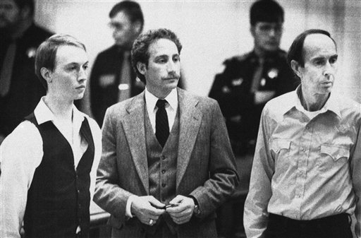 This Dec. 18, 1984 file photo shows Don Nichols, right, standing with his son, Dan Nichols, left, as they pled not guilty in court in Virginia City, Mont. Standing with them is attorney, Steve Ungar. (AP Photo/File)